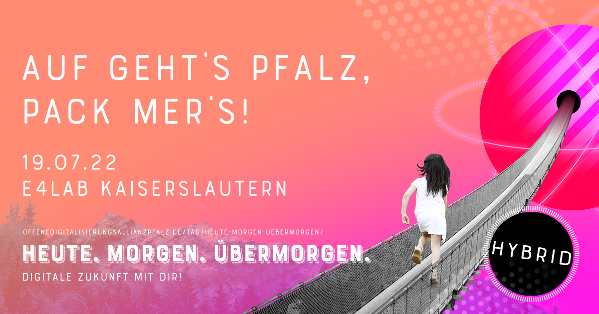Am 19.07.22 von 14 bis 18 Uhr findet die hybride Abschlussveranstaltung „Auf geht’s Pfalz, pack mer’s“ der Veranstaltungsreihe „Heute. Morgen. Übermorgen. – Digitale Zukunft mit Dir!“ mit dem Digitalisierungsexperten Dr. Michael Gebert und vielen weiteren GesprächspartnerInnen in Kaiserslautern statt. Hier werden die Ergebnisse der vorangegangenen Workshops präsentiert und Handlungsempfehlungen vorgestellt. Teilnehmende auch ohne Vorkenntnisse sind herzlich eingeladen!