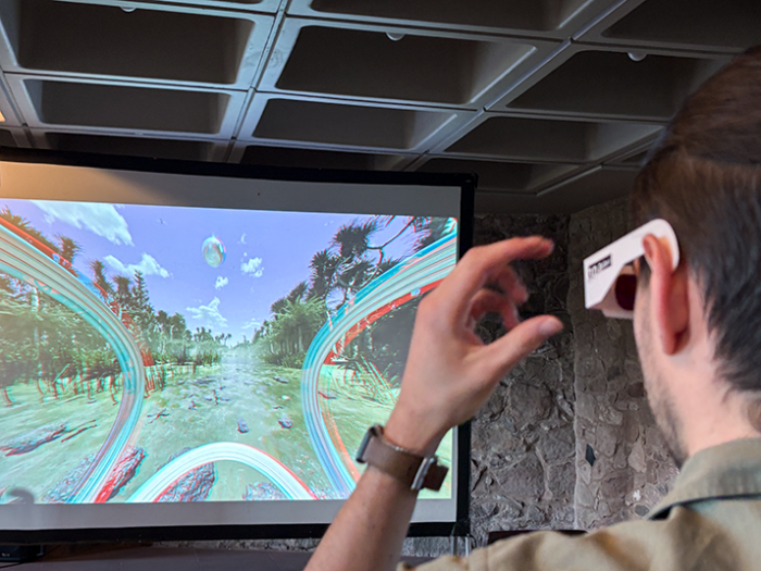 Ein besonderer Höhepunkt des Abends waren speziell aufbereitete Bilder aus der finalen Draisinen-Tour, welche im Vortrag verteilt die Besuchenden mittels ausgeteilten Rot-Blau-3D-Brillen (Anaglyphen-3D) in Stereoskopie genießen konnten. Die räumliche Darstellung sorgte für sichtliche Begeisterung, nicht zuletzt durch die eingeforderte Zusammenarbeit mit dem Publikum, welche mit einem lebendigeren Eindruck der virtuellen Welt belohnt wurde. Einige ausgewählte Teilnehmer hatten zudem die Gelegenheit, erste Sequenzen der Attraktion direkt über eine VR-Brille zu erleben – Parallel dazu konnten die übrigen Besucher das Geschehen über eine Leinwand mit ihren 3D-Brillen mitverfolgen.
