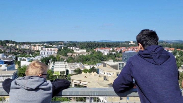Eindruck vom Schülerferienprogramm in den Sommerferien: Teilnehmende bestimmen die Höhe des Gebäudes 47 der TU Kaiserslautern mithilfe einer smarten Wetterstation und genießen den Ausbllick. Bild: Sven Forte